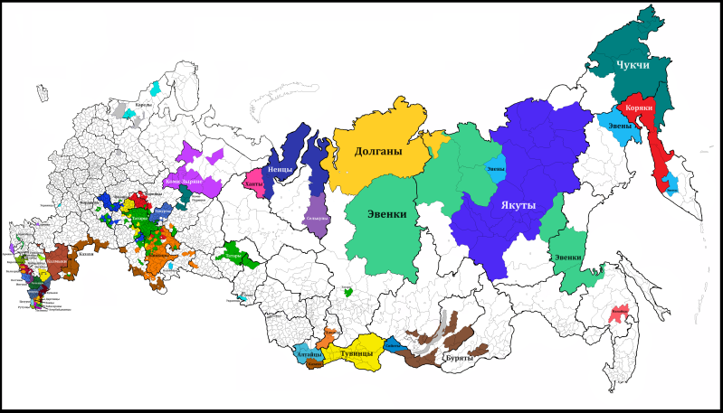 4. Map of the distribution of the different ethnic groups in Russia (when an ethnic group, Russians excluded, makes up more than 20% of a district's population, this is indicated). (source: see below)