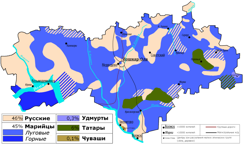 8. Map of the ethnic composition of the Republic of Mari-El: Russians (yellow), Meadow-Mari (light blue), Hill-Mari (dark blue), Udmurts (purple), Tatars (green) and Chuvash (brown).