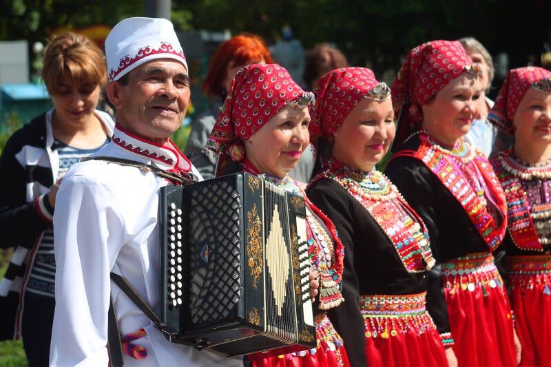 15. Eastern Mari people from the city of Krasnoufimsk in the Sverdlovsk Oblast, during a parade in Yoshkar-Ola. Source: see below.