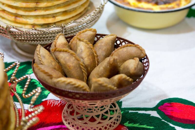 Due to the abundance of forests, rivers, lakes and meadows in the territory of the Mari, the traditional cuisine is very rich in all kinds of fish and meat dishes (fish soup, dried, fried and salted fish, stewed bear meat, baked hare, moose shashlyk, …). Potatoes are often used as the basis for many dishes, but also mushrooms, honey and all kinds of berries play an important role. Because the Mari had close contact with the Russians, the Tatars and the Chuvash throughout history, there are many dishes that are also characteristic of the cuisines of these peoples. Between the different regions of the Mari territory, both the name and the preparation of the recipes can differ greatly. Below are some common dishes for the traditional cuisine of the Mari: (The names are written Meadow-Mari and Hill-Mari respectively - the latter one only when available)