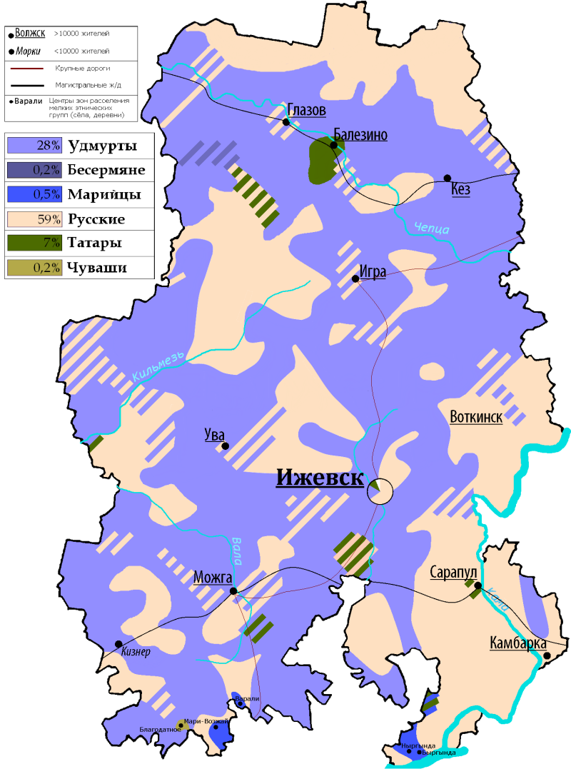 8. Map of the ethnic composition of the Republic of Udmurtia: Udmurts (light blue), Besermyans (purple), Mari (dark blue), Russian (yellow), Tatars (green) and Chuvash (brown).