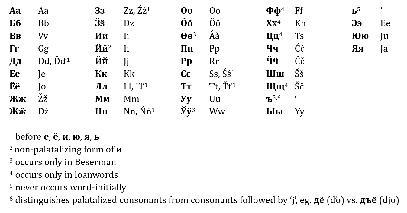 The Udmurt language uses the Russian Cyrillic alphabet, with some additional characters added (ӝ, ӟ, ӥ , ӧ and ӵ). In 2017, a first alphabet was developed for the Beserman language. The alphabet contains all letters used in the Udmurt alphabet, and also includes the letters ө and ў. In 2021, a book in Besermyan was published for the first time, using a slightly different version of the previous described alphabet.