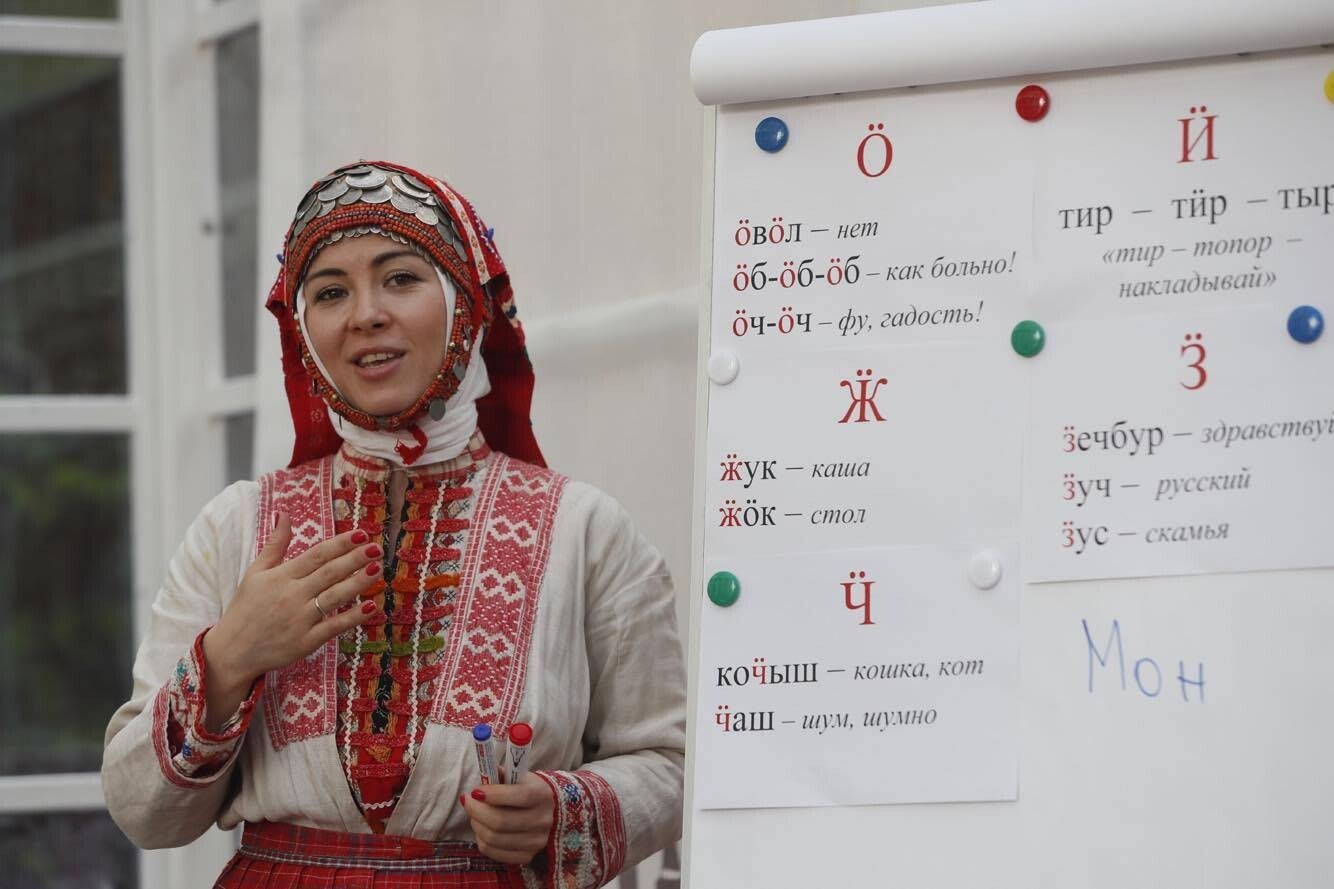 19. A woman giving an introduction to the Udmurt alphabet (note the five non-Russian letters ӧ, ӥ, ӝ, ӟ and ӵ). Author & source: see below.