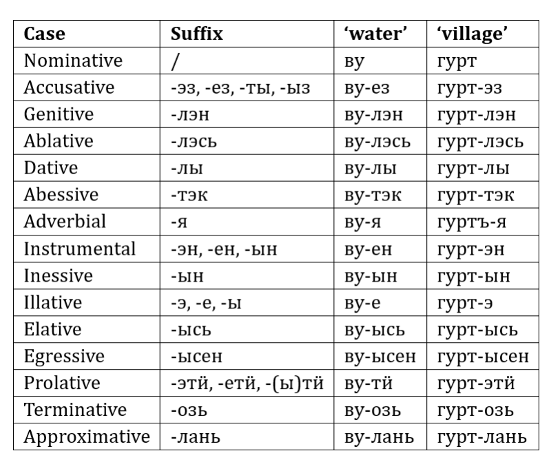In standard Udmurt, 15 grammatical cases can be distinguished, including 7 locative cases. In some dialects, the number of cases can very. For the accusative case, two forms exist, -ез/-эз (-jez/-ez) for nouns in singular and -ты (-ty, in northern dialects) or -ыз (-yz, in southern dialects) for nouns in plural. In the tabel below the nouns ву (vu) 'water' and гурт (gurt) 'village' are featured.